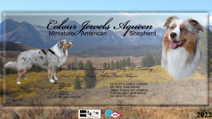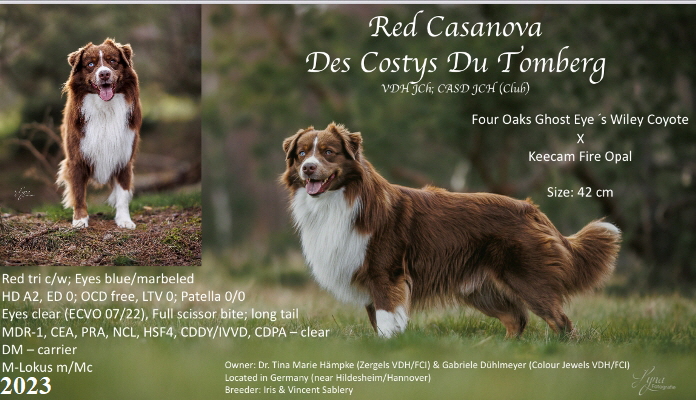 18 Oktober 2020 geboren, red tri, ca 42 cm groß Gebiss: Schere und vollzahnig DOK 7.7.2022 Befund frei HD A1, ED 0, PT frei, OCD: frei, LÜW frei, HASF4, CEA, PRA, MDR1, frei, DM Carrier, ZZL : ohne Einschränkungen